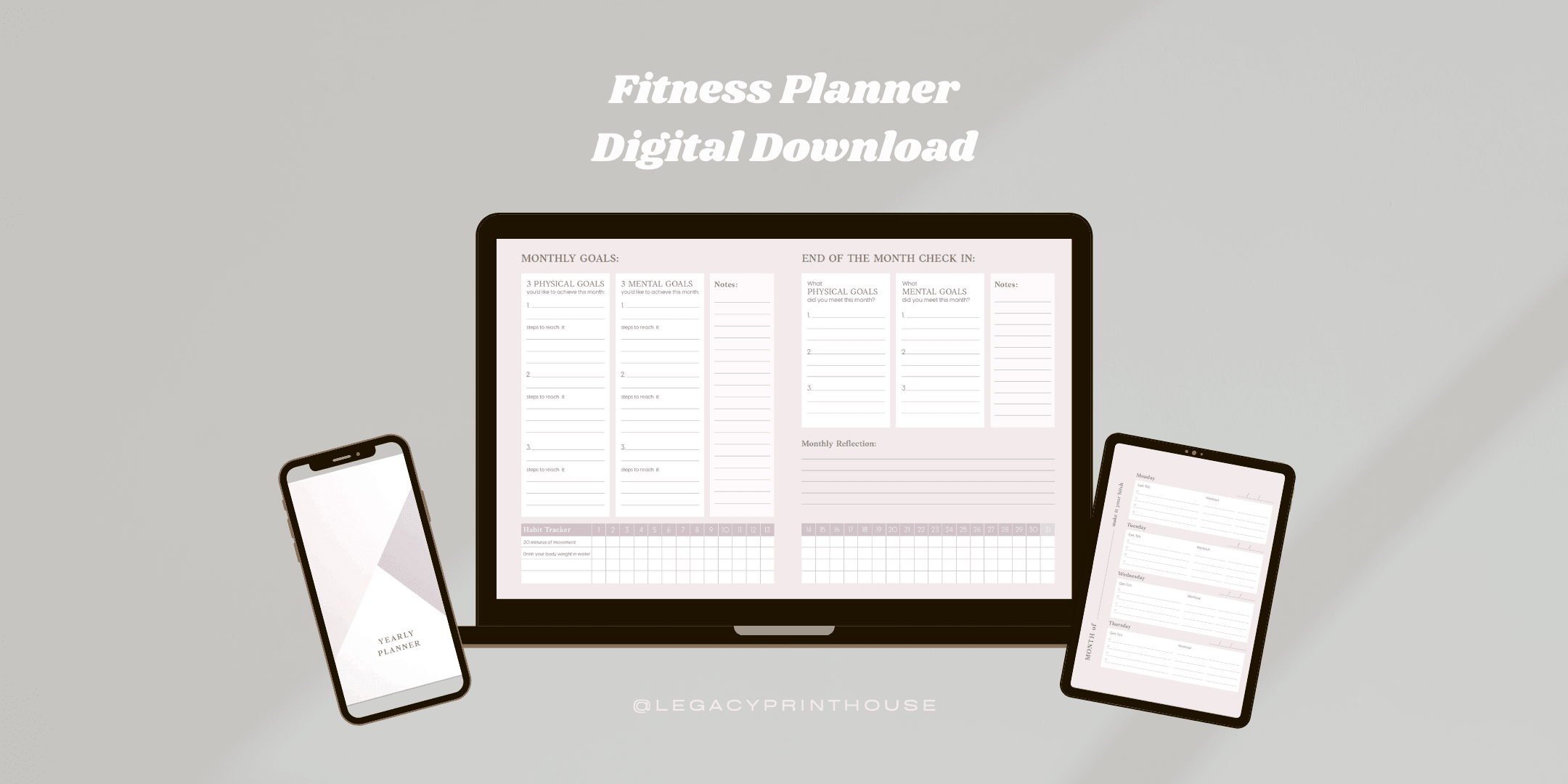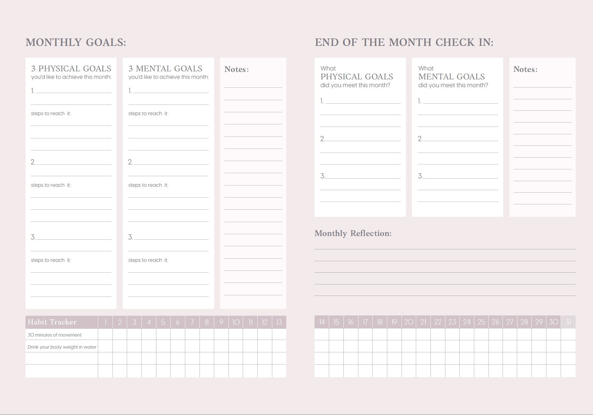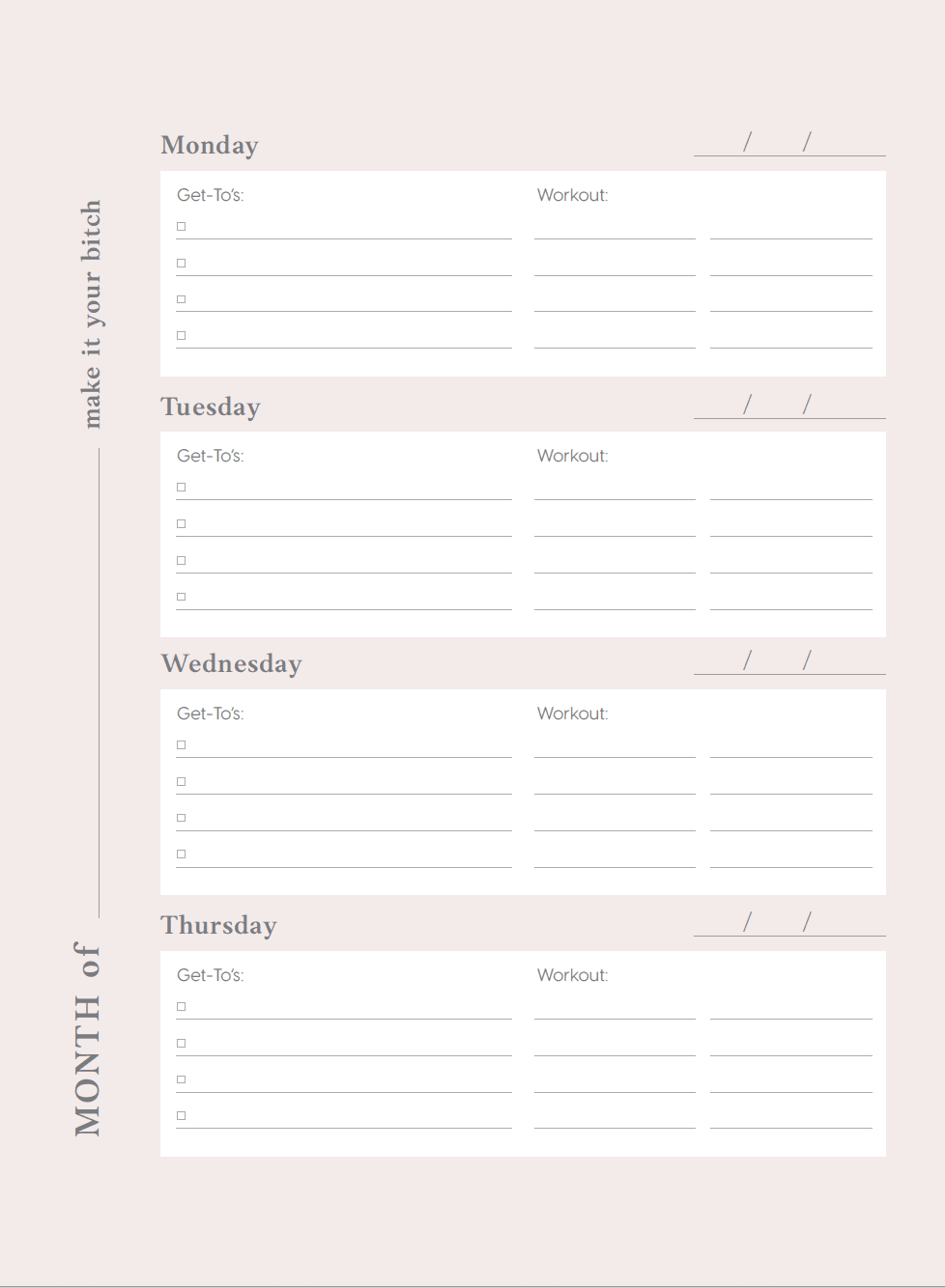 Our UNDATED Fitness Planner is a day-to-day planner designed to help plan your life and achieve fitness and mental health goals. With unique features like workout and meal planning sections, goal setting pages, this planner is going to help set yourself up for success when aiming for change.